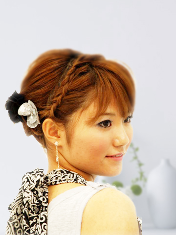 お顔の周りに三つ編みの編み込みをあしらったアップスタイル
